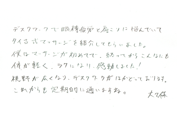 僕はマッサージが初めてで、終わってからこんなにも体が軽く、ラクになり、感動しました!