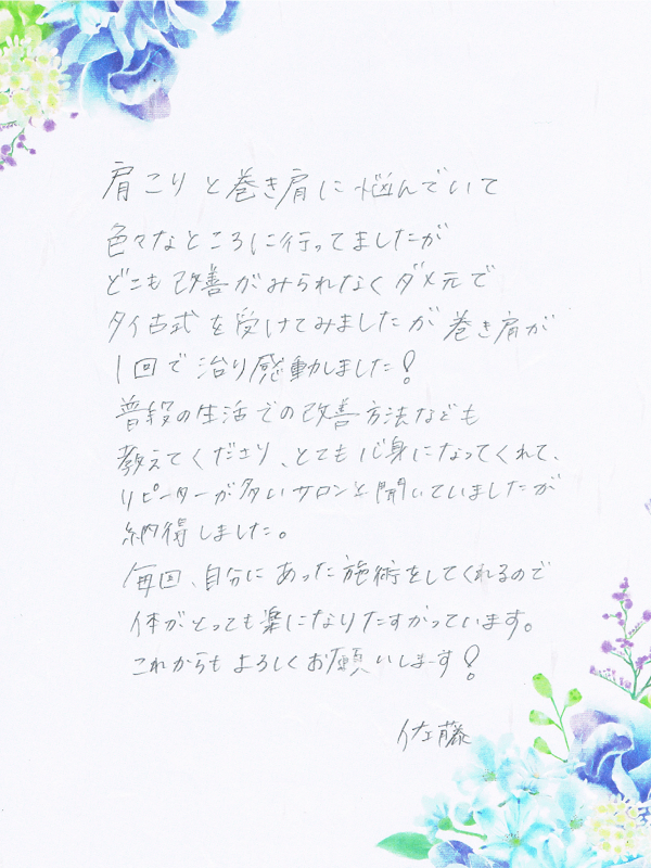 肩こりと巻き肩に悩んでいて色々なところに行ってましたがどこも改善が見られなくダメ元でタイ古式を受けてみましたが巻き肩が1回で治り感動しました!