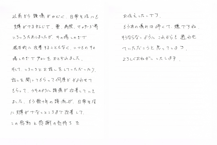 そして、いろいろとお話しをしていただいたり、話を聞いてもらって何度かかよわせてもらって、うそのように頭痛が改善していきました。もう数十年の頭痛が、日常生活に支障がでないところまで改善して、この感動と感謝の気持ちをお伝えしたいです。