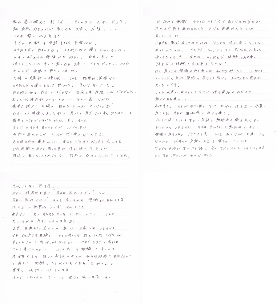毎回、自分にあった施術をしてくれるので体がとっても楽になりたすかっています。