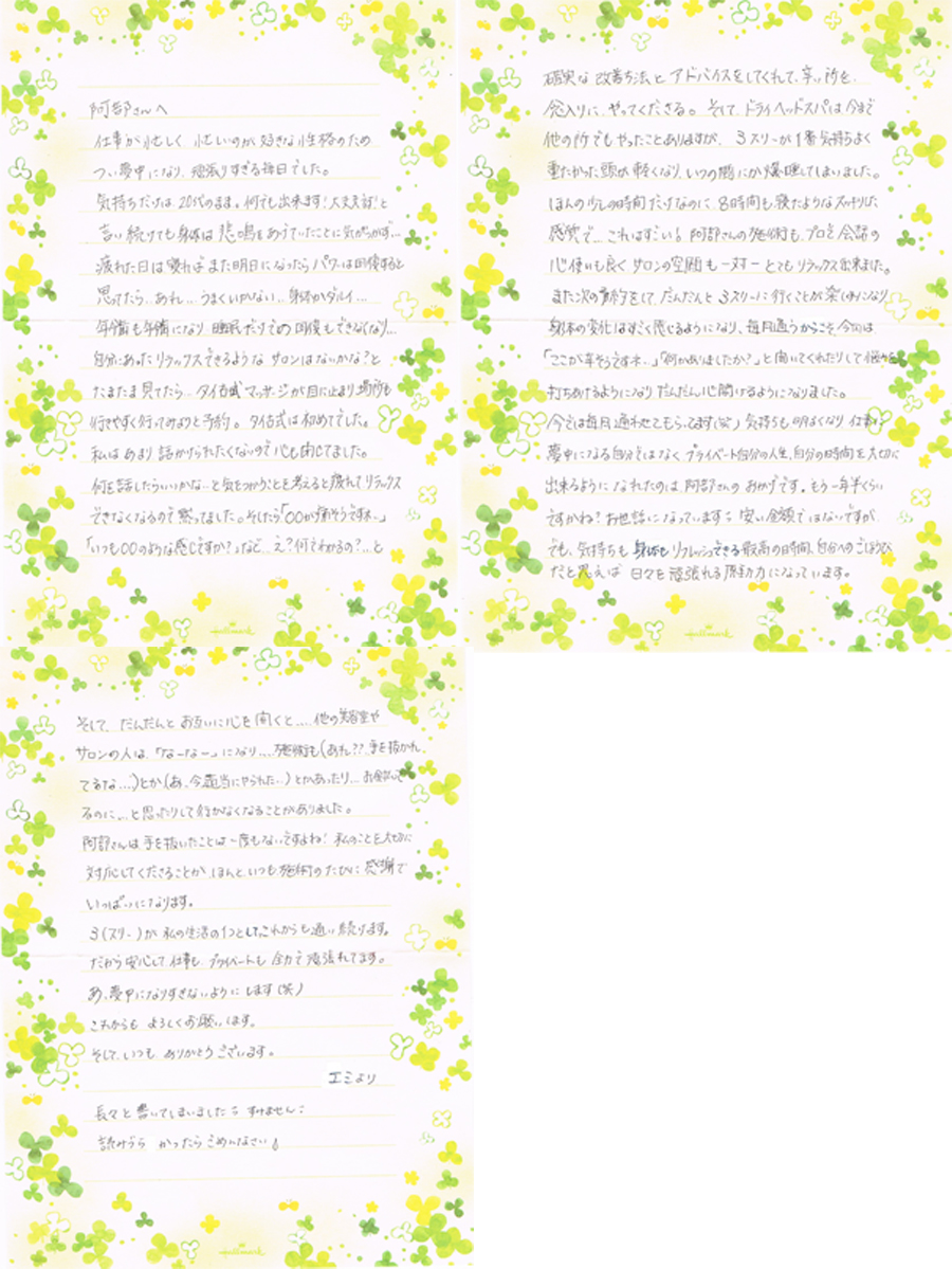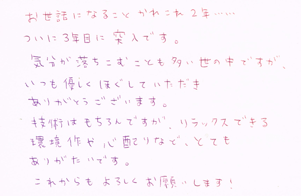 私のことを大切に対応してくださることが、ほんと、いつも施術のたびに感謝でいっぱいになります。