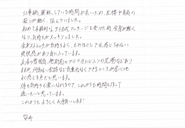 タイ古式は初めてでした。私はあまり話しかけられたくないので心も閉じてました。何を話したらいいかな…と気をつかうことを考えると疲れリラックスできなくなるので黙ってました。
